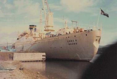 | Keywords: Ena G-Nauru Pacific Line.jpg The Enna G a boat of the en Nauru Pacific Line on the port of en Ponape Micronesia Prinses Margriet built in 1961 Sold to Nauru in 1970 and renamed Enna G PHOTOS OF THE PONAPE COMMERCIAL DOCK AND HARBOR FACILITIES 1977 - Reel 4032 http //libweb hawaii edu/digicoll/ttp/ttp_jpg/403201 jpg Trust Territory of the Pacific Islands Hawaii university library 1977 PD-USGov Transport in Nauru Pohnpei Island | ||||