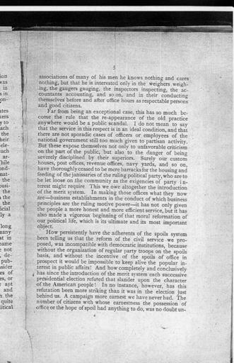| Keywords: Encouragements and Warnings p05.JPG en Speech of National Civil Service Reform League president Carl Schurz before its annual meeting of December 10 1896 in Philadelphia p 5 Single page scan 200 dpi Carl Schurz Encouragements and Warnings National Civil Service Reform League 1896; courtesy of Boston Public Library Carl Schurz 1896-12-10 PD-Old Encouragements and Warnings Page Images | ||||