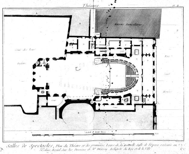 | Keywords: Encyclopedie volume 9-056.png  Floor plan at the level of the first loges of the Théâtre de l'Opéra on the rue Saint-Honoré Palais-Royal Paris also known as Moreau's opera house Diderot's Encyclopédie vol 10 Théâtres Salle de l'Opéra plate 2 1770 inauguration of the theatre http //gallica bnf fr/ark /12148/bpt6k50564m/f57 image r langEN Gallica architect Creator Pierre-Louis Moreau-Desproux engraver Robert Bénard Book Encyclopedie Planches 9 055 057 PD-old-100-1923 Encyclopédie ou Dictionnaire raisonné des sciences des arts et des métiers volume 9 056 Seconde salle du Palais-Royal Engravings by Robert Bénard |