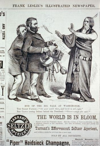 Keywords: End of the big talk at Washington, color film copy slide.jpg ;TITLE End of the big talk at Washington ;SUMMARY Editorial cartoon shows President Ulysses S Grant with his arms behind his back and with Interior Secretary Columbus Delano hiding behind him standing before Red Cloud Chief of the Oglala Sioux Delano extending his arms pretending to be Grant offers a handful of cooking utensils and presents a receipt Recd for Black Hills 25 000 in 'Goods' to Red Cloud asking him to make his mark Red Cloud seeing Delano behind the president replies Never--except for cash cph 3b48689 1875-06-19 Illus in Frank Leslie's illustrated newspaper v 40 1875 June 19 p 244 PD-old Columbus Delano |