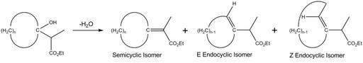 Keywords: Endocyclic isomers products.png en Elimination of water from tertiary alcohols proceeds via an E1 mechanism The three major products formed are shown above own Chem540f09grp4 2009-11-09 Organic reactions