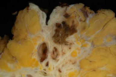 | Keywords: Endometriosis, abdominal wall 2.jpg The photo shows the same case presented in Image Endometriosis abdominal wall jpg For the photo I moved in a little closer and immersed the specimen in a shallow pan of water Whether it's better to shoot specimens dry or immersed is a matter of taste I prefer the more natural look of immersed specimens but others like the sharpness of dry surfaces If you do shoot specimens dry be sure to sop as much moisture off the surface as possible Otherwise distracting highlights will ruin the picture Both photos were taken with a Nikon D100 digital SLR camera through a Sigma 50mm macro lens The camera was set for manual focus incandescent light balance and aperture priority exposure mode at f/8 Both shots looked a little dark on the computer monitor so I expanded the dynamic range in Photoshop using the Levels command The only other digital editing was slight cropping of the top photo and downsampling to proper size 650 pixels greatest linear dimension for screen display There was no sharpening or color correction The imaged was saved in JPEG format with the quality setting 8 High The black background is a piece of velvet Photograph by Ed Uthman MD Public domain Posted 22 May 04 http //web2 airmail net/uthman/specimens/index html PD Ed Uthman Gross pathology Endometriosis |