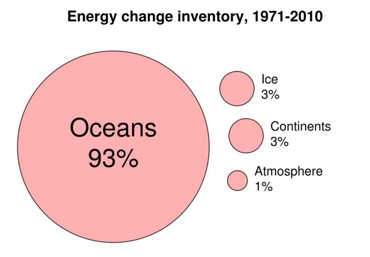 | Keywords: Energy change inventory, 1971-2010.svg anthropogenic i e human greenhouse gases has been distributed on the Earth This is referred to as radiative imbalance where less energy leaves Earth's atmosphere than enters it Earth has been in radiative imbalance since at least the 1970s Most of this extra energy has been absorbed by the oceans Data The following data shows how the extra energy trapped mainly by anthropogenic greenhouse gases has been distributed on the Earth between 1971 and 2010 Oceans 93 Ice 3 Continents 3 Atmosphere 1 The biggest uncertainty is found in the energy invertory of the deep ocean more than 700 m due to a scarcity of data points The deep ocean accounts for 29 procent of the total extra energy trapped Further information can be found in the source listed in the references section References citation 2013-06-07 Rhein M et al Qin D and T Stocker Box 3 1 in Chapter 3 Observations Ocean final draft Climate Change 2013 The Physical Science Basis Working Group I Contribution to the Intergovernmental Panel on Climate Change IPCC 5th Assessment Report http //www climatechange2013 org/images/uploads/WGIAR5_WGI-12Doc2b_FinalDraft_Chapter03 pdf http //www ipcc ch/report/ar5/wg1/ IPCC pp 11-12 pp 14-15 of PDF chapter 2013-10-25 own Enescot Change in total heat content of earth svg Comma-separated values In this graph the area of the circles is proportional to the sink's absorption of energy The radius of the circles equals the square root of area / Ï Data were exported from OpenOffice org 4 0 0 Calc as comma separated values csv The following options were used Character set Western Europe 1252 Field delimiter Text delimiter Quote all text cells no Save cell content as shown yes Fixed column width no <pre> Sink a area r radius d diameter Oceans 93 5 4408473067 10 8816946134 Ice 3 0 9772050238 1 9544100476 Continents 3 0 9772050238 1 9544100476 Atmosphere 1 0 5641895835 1 1283791671 </pre> cc-zero Uploaded with UploadWizard Global warming graphs |