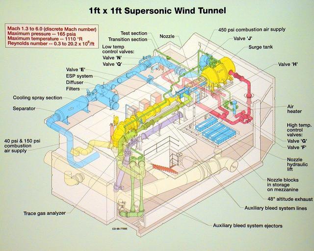 | Keywords: map drawing indoor sketch illustration (CD-98-77895): This phantom drawing of the 1x1-Foot Supersonic Wind Tunnel shows its major components and arrangement. Its 11 nozzles, with a storage area on the basement mezzanine and the hydraulic elevator to insert them into the tunnel, make this a very versatile facility. (CD-98-77895): This phantom drawing of the 1x1-Foot Supersonic Wind Tunnel shows its major components and arrangement. Its 11 nozzles, with a storage area on the basement mezzanine and the hydraulic elevator to insert them into the tunnel, make this a very versatile facility. |