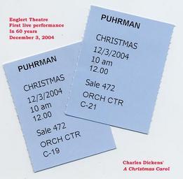 | Keywords: Englert Civic Theatre opening matinee ticket stubs 12-3-04.tif en Admission ticket stubs to the premiere reopening of Iowa City's Englert under its current non-profit ownership as Englert Civic Theatre Images of the stubs were electronically mounted by Bob Hibbs for display in his Hibbs Research Library of Iowa City History The production was a musical adaptation of the 1843 Charles Dickens holiday classic A Christmas Carol Created December 4 2004 own orginal by Bob Hibbs The stubs themselves are now in a collection of Englert Theater memorabilia contained in the Hibbs Research Library of Iowa City History The collection also contains a small carpet remnant found under a seat at the premiere Bob Hibbs who resides in his family home of more than 40 years Kinchouse in Iowa City Iowa cc-zero Englert Theatre Iowa City Iowa Uploaded with UploadWizard Culture show tickets |