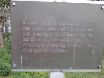 | Keywords: English Cemetery at Fårö (3).jpg en Sign at the English Cemetery in the Swedish island of Fårö The sign reads Here lies some 20 English navy men who died of cholera in 1854 during the so-called Crimean War when Fårösund served as a base for a Anglo-French naval unit NW of the cemetery where the place of a currently set up hospital sv Skylt vid Engelska kyrkogården på Fårö Skylten lyder Här vilar ett 20-tal engelska örlogsmän som avled i kolera år 1854 under det s k Krimkriget då Fårösund utgjorde bas för en engelsk-fransk flottenhet NV om kyrkogården låg då ett för tillfället upprättat sjukhus own Mr Bullitt 2010-08-07 Engelska kyrkogården |