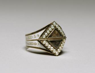 | Keywords: English - Memorial Ring - Walters 44528 - Three Quarter.jpg This ring commemorates two siblings who are named in the gold inscriptions on white enamel The color of the enamel associated with purity indicates that they were unmarried The ring is comprised of two halves that mirror each other and are held together by small pins and sockets The bezel is divided by two separate triangular compartments with pearl borders each containing a lock of one sibling's hair During the 17th and 18th centuries it became customary in England to commemorate loved ones with memorial rings which were distributed at the funeral From around 1770 they often contained miniature portraits or held locks of the deceased's hair in small compartments accompanied by inscriptions identifying the person to be remembered ca 1804 1805 gold enamel pearls hair cm 2 2 2 accession number 44 528 2520 Henry Walters Baltimore date and mode of acquisition unknown Walters Art Museum Henry Walters Acquired by Henry Walters Transcription Inscribed on the shoulders of the ring C M BURNLEY DIED 3 MAR 1804 AGED 19 and A E BURNLEY DIED 8 JULY 1804 AGED 20 Jewelry - Ancient to Modern The Walters Art Gallery Baltimore 1979-1980 Objects of Adornment Five Thousand Years of Jewelry from the Walters Art Gallery Baltimore Cooper-Hewitt National Design Museum New York; Chrysler Museum of Art Norfolk; Carnegie Museum of Art Pittsburgh; San Antonio Museum of Art San Antonio; Philbrook Museum of Art Tulsa; Honolulu Academy of Arts Honolulu; New Orleans Museum of Art New Orleans; Milwaukee Art Museum Milwaukee; Minneapolis Institute of Arts Minneapolis; Toledo Museum of Art Toledo; The John and Mable Ringling Museum of Art Sarasota 1984-1987 Bedazzled 5 000 Years of Jewelry from the Walters Art Museum Frist Center for the Visual Arts Nashville; The John and Mable Ringling Museum of Art Sarasota; The Walters Art Museum Baltimore 2006-2009 Bedazzled 5 000 Years of Jewelry El Paso Museum of Art El Paso 2010 Jewelry from the Walters Art Museum and the Zucker Family Collection The Walters Art Gallery Baltimore 1987 place of origin England United Kingdom Walters Art Museum license Jewellery in the Walters Art Museum Gothic art in the United Kingdom Media contributed by the Walters Art Museum needs category review 1800s jewellery Memorial rings |