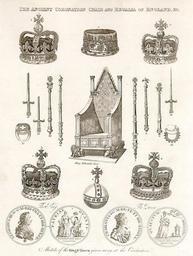 | Keywords: EnglishCoronationRegalia.jpg thumb Index of the coronation items 1 en Imperial State Crown<br> 2 Mary of Modena's Diadem<br> 3 <br> 4 One of the four Swords borne before the monarch <br> 5 Sword of Mercy<br> 6 <br> 7 The Sovereign's Staff St Edward's Staff <br> 8 Sovereign's Ring<br> 9 King Edward's Chair the Coronation chair <br> 10 <br> 11 Sceptre with the Dove<br> 12 <br> 13 One of the four Swords borne before the monarch <br> 14 Queen-Consort's Ring<br> 15 St Edward's Crown<br> 16 Sovereign's Orb<br> 17 <br> thumb Index der Gegenstände Diadem der Mary von Modena Eines der vier Schwerter die dem Monarchen vorangetragen werden Schwert der Gnade Herrscherring Edwardsthron der Krönungsthron Sankt Edwards Stab Szepter mit der Taube Eines der vier Schwerter Ring des Königingemahls de Edwardskrone Reichsapfel Hume's History of England 1814 http //www antiqueprints com/Prints/historic_scenes html 1814 Author PD-old-100 page on en wikipedia Crown jewels of the United Kingdom King Edward's Chair |