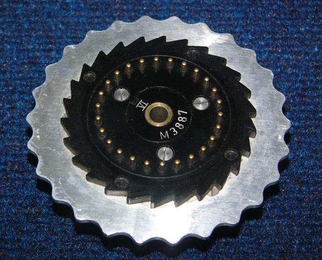 | Keywords: Enigma-rotor-BP.jpg  A rotor from an en Enigma machine showing the outer finger grooves the ratchet notches and the circle of 26 pins A Roman numeral VI is visible on the rotor indicating that this was a Naval Enigma rotor This rotor was on display at en Bletchley Park museum Original photograph by en User Matt Crypto released into the public domain en wikipedia 2005-01-01 Matt Crypto wikipedia en Matt Crypto original upload log page en wikipedia Enigma-rotor-BP jpg 2005-01-01 18 18 Matt Crypto 2055×1661×8 555312 bytes <nowiki>An Enigma rotor Original photograph by User Matt Crypto PD </nowiki> Enigma machine rotors |
