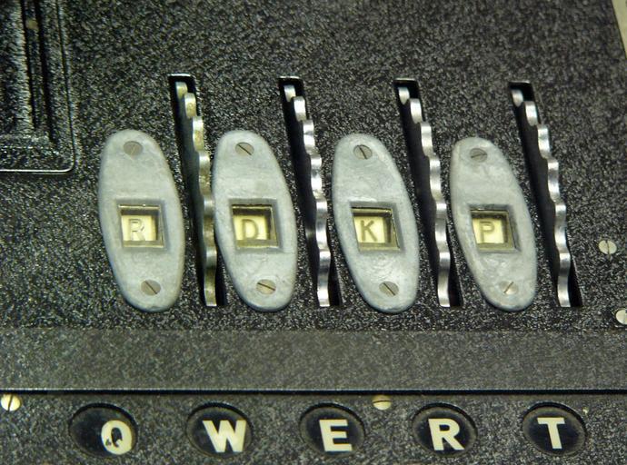 | Keywords: Enigma-rotor-windows.jpg  Close-up of the rotor windows of a four-rotor Naval Enigma machine M4 Walzenfenster der ENIGMA-M4 Figure 2 With the inner lid placed down the Enigma is ready for use The finger wheels of the rotors protrude through the lid allowing the operator to set the rotors and the current position ” here <tt>RDKP</tt> ” is visible to the operator through a set of windows Zicht op de positie van de rotors bij een Kriegsmarine M4 model PierÅ›cienie rÄ™czne wystajÄ… przez obudowÄ™ umożliwiajÄ…c ustawienie bÄ™benków uploaded in english wikipedia on 31 Dec 2004 by author en User Matt Crypto released in PD by author Enigma-rotor-windows-cropped jpg Enigma-rotor-windows-cropped2 jpg - Matt Crypto Enigma machine rotors |