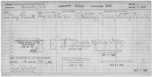 | Keywords: Enrollment for Cherokee Census Card R312 - NARA - 259375.tif Scope and content Name Sallie Boyd Type Parent Sex Female Name Wesley Boyd Type Parent Sex Male Name William O Boyd Type Rejected Age 29 Sex Male Degree Indian Blood Intermarried White City of Residence Claremore General notes 259375 Local identifier 75-53A-CHEROKEE R312 Department of the Interior Office of Indian Affairs Office of the Commissioner to the Five Civilized Tribes 1893 - 1914 NARA's Southwest Region Fort Worth NRFA 1400 John Burgess Drive Fort Worth TX 76140 Record group Record Group 75 Records of the Bureau of Indian Affairs 1793 - 1999 Record group ARC 404 Enrollment Cards compiled 1898 - 1914 Series ARC 251747 File unit File unit ARC Variant control numbers NAIL Control Number NRFF-75-53A-2113<br /> NAIL Control Number NRFF-75-53A-2115<br /> NAIL Control Number NRFF-75-53A-2116<br /> NAIL Control Number NRFF-75-53A-CHEROKEE R312 yes Other versions <gallery> File Enrollment_for_Cherokee_Census_Card_R312_-_NARA_-_259375 tif tif File Enrollment_for_Cherokee_Census_Card_R312_-_NARA_-_259375 jpg jpg </gallery> NARA-cooperation PD-USGov Cherokee census cards NARA TIF images with categorized JPGs |