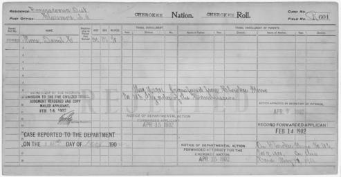 | Keywords: Enrollment for Cherokee Census Card R601 - NARA - 259664.tif Scope and content Name Daniel C Moore Type Rejected Age 39 Sex Male Degree Indian Blood 1/8 City of Residence Claremore General notes 259664 Local identifier 75-53A-CHEROKEE R601 Department of the Interior Office of Indian Affairs Office of the Commissioner to the Five Civilized Tribes 1893 - 1914 NARA's Southwest Region Fort Worth NRFA 1400 John Burgess Drive Fort Worth TX 76140 Record group Record Group 75 Records of the Bureau of Indian Affairs 1793 - 1999 Record group ARC 404 Enrollment Cards compiled 1898 - 1914 Series ARC 251747 File unit File unit ARC Variant control numbers NAIL Control Number NRFF-75-53A-13337<br /> NAIL Control Number NRFF-75-53A-CHEROKEE R601 yes Other versions <gallery> File Enrollment_for_Cherokee_Census_Card_R601_-_NARA_-_259664 tif tif File Enrollment_for_Cherokee_Census_Card_R601_-_NARA_-_259664 jpg jpg </gallery> NARA-cooperation PD-USGov Cherokee census cards NARA TIF images with categorized JPGs |