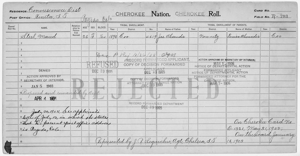 | Keywords: Enrollment for Cherokee Census Card R793 - NARA - 259856.tif Scope and content Name James Alexander Type Parent Sex Male Name Louisa Alexander Type Parent Sex Female Name Maud Stell Type Rejected Age 26 Sex Female Degree Indian Blood 1/64 City of Residence Vinita General notes 259856 Local identifier 75-53A-CHEROKEE R793 Department of the Interior Office of Indian Affairs Office of the Commissioner to the Five Civilized Tribes 1893 - 1914 NARA's Southwest Region Fort Worth NRFA 1400 John Burgess Drive Fort Worth TX 76140 Record group Record Group 75 Records of the Bureau of Indian Affairs 1793 - 1999 Record group ARC 404 Enrollment Cards compiled 1898 - 1914 Series ARC 251747 File unit File unit ARC Variant control numbers NAIL Control Number NRFF-75-53A-18333<br /> NAIL Control Number NRFF-75-53A-357<br /> NAIL Control Number NRFF-75-53A-358<br /> NAIL Control Number NRFF-75-53A-CHEROKEE R793 yes Other versions <gallery> File Enrollment_for_Cherokee_Census_Card_R793_-_NARA_-_259856 tif tif File Enrollment_for_Cherokee_Census_Card_R793_-_NARA_-_259856 jpg jpg </gallery> NARA-cooperation PD-USGov Cherokee census cards NARA TIF images with categorized JPGs |