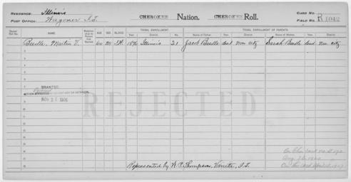 | Keywords: Enrollment for Cherokee Census Card R1042 - NARA - 260105.tif Scope and content Name Jacob Beedle Type Parent Sex Male Name Martin V Beedle Type Rejected Age 60 Sex Male Degree Indian Blood Intermarried White City of Residence Wagonerejected Name Sarah Beedle Type Parent Sex Female General notes 260105 Local identifier 75-53A-CHEROKEE R1042 Department of the Interior Office of Indian Affairs Office of the Commissioner to the Five Civilized Tribes 1893 - 1914 NARA's Southwest Region Fort Worth NRFA 1400 John Burgess Drive Fort Worth TX 76140 Record group Record Group 75 Records of the Bureau of Indian Affairs 1793 - 1999 Record group ARC 404 Enrollment Cards compiled 1898 - 1914 Series ARC 251747 File unit File unit ARC Variant control numbers NAIL Control Number NRFF-75-53A-1466<br /> NAIL Control Number NRFF-75-53A-1468<br /> NAIL Control Number NRFF-75-53A-1470<br /> NAIL Control Number NRFF-75-53A-CHEROKEE R1042 yes Other versions <gallery> File Enrollment_for_Cherokee_Census_Card_R1042_-_NARA_-_260105 tif tif File Enrollment_for_Cherokee_Census_Card_R1042_-_NARA_-_260105 jpg jpg </gallery> NARA-cooperation PD-USGov Cherokee census cards NARA TIF images with categorized JPGs |