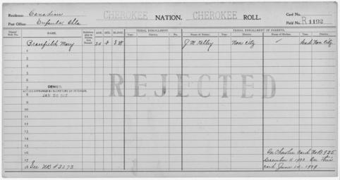 | Keywords: Enrollment for Cherokee Census Card R1192 - NARA - 260255.tif Scope and content Name Mary Brassfield Type Rejected Age 24 Sex Female Degree Indian Blood Intermarried White City of Residence Eufaula ok Name J M Kelley Type Parent Sex Male General notes 260255 Local identifier 75-53A-CHEROKEE R1192 Department of the Interior Office of Indian Affairs Office of the Commissioner to the Five Civilized Tribes 1893 - 1914 NARA's Southwest Region Fort Worth NRFA 1400 John Burgess Drive Fort Worth TX 76140 Record group Record Group 75 Records of the Bureau of Indian Affairs 1793 - 1999 Record group ARC 404 Enrollment Cards compiled 1898 - 1914 Series ARC 251747 File unit File unit ARC Variant control numbers NAIL Control Number NRFF-75-53A-10390<br /> NAIL Control Number NRFF-75-53A-2244<br /> NAIL Control Number NRFF-75-53A-CHEROKEE R1192 yes Other versions <gallery> File Enrollment_for_Cherokee_Census_Card_R1192_-_NARA_-_260255 tif tif File Enrollment_for_Cherokee_Census_Card_R1192_-_NARA_-_260255 jpg jpg </gallery> NARA-cooperation PD-USGov Cherokee census cards NARA TIF images with categorized JPGs |