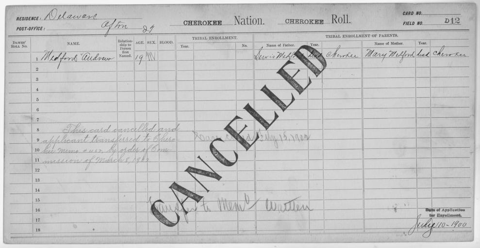 Keywords: Enrollment for Cherokee Census Card D12 - NARA - 251760.jpg Scope and content Name Andrew Medford Type Doubtful Age 19 Sex Male City of Residence Afton Name Mary Medford Type Parent Sex Female Name Servis Medford Type Parent Sex Male General notes 251760 Local identifier 75-53A-CHEROKEE D12 Department of the Interior Office of Indian Affairs Office of the Commissioner to the Five Civilized Tribes 1893 - 1914 NARA's Southwest Region Fort Worth NRFA 1400 John Burgess Drive Fort Worth TX 76140 Record group Record Group 75 Records of the Bureau of Indian Affairs 1793 - 1999 Record group ARC 404 Enrollment Cards compiled 1898 - 1914 Series ARC 251747 File unit File unit ARC Variant control numbers NAIL Control Number NRFF-75-53A-12981<br /> NAIL Control Number NRFF-75-53A-12982<br /> NAIL Control Number NRFF-75-53A-12983<br /> NAIL Control Number NRFF-75-53A-CHEROKEE D12 Other versions <gallery> File Enrollment_for_Cherokee_Census_Card_D12_-_NARA_-_251760 tif tif File Enrollment_for_Cherokee_Census_Card_D12_-_NARA_-_251760 jpg jpg </gallery> NARA-cooperation PD-USGov Cherokee census cards |