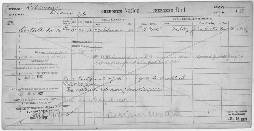 | Keywords: Enrollment for Cherokee Census Card D17 - NARA - 251765.jpg Scope and content Name Andrew W Cooter Type Doubtful Age 31 Sex Male Degree Indian Blood Intermarried White City of Residence Miami Name Ew Cooter Type Parent Sex Male Name Julia Cooter Type Parent Sex Female General notes 251765 Local identifier 75-53A-CHEROKEE D17 Department of the Interior Office of Indian Affairs Office of the Commissioner to the Five Civilized Tribes 1893 - 1914 NARA's Southwest Region Fort Worth NRFA 1400 John Burgess Drive Fort Worth TX 76140 Record group Record Group 75 Records of the Bureau of Indian Affairs 1793 - 1999 Record group ARC 404 Enrollment Cards compiled 1898 - 1914 Series ARC 251747 File unit File unit ARC Variant control numbers NAIL Control Number NRFF-75-53A-4350<br /> NAIL Control Number NRFF-75-53A-4352<br /> NAIL Control Number NRFF-75-53A-4354<br /> NAIL Control Number NRFF-75-53A-CHEROKEE D17 Other versions <gallery> File Enrollment_for_Cherokee_Census_Card_D17_-_NARA_-_251765 tif tif File Enrollment_for_Cherokee_Census_Card_D17_-_NARA_-_251765 jpg jpg </gallery> NARA-cooperation PD-USGov Cherokee census cards |