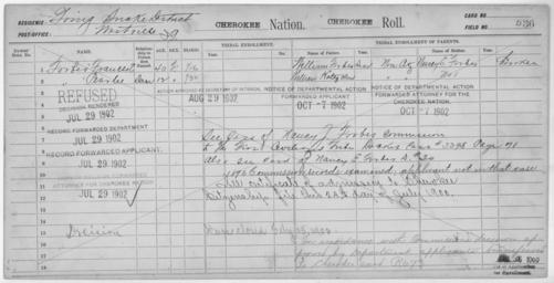 | Keywords: Enrollment for Cherokee Census Card D36 - NARA - 251784.jpg Scope and content Name Francis E Forbes Type Doubtful Age 40 Sex Female Degree Indian Blood 1/16 City of Residence Westville Name Nancy Forbes Type Parent Sex Female Name Pearlie Forbes Type Doubtful Age 12 Sex Female Degree Indian Blood 1/32 City of Residence Westville Name William Forbes Type Parent Sex Male Name William Hotezclaw Type Parent Sex Male General notes 251784 Local identifier 75-53A-CHEROKEE D36 Department of the Interior Office of Indian Affairs Office of the Commissioner to the Five Civilized Tribes 1893 - 1914 NARA's Southwest Region Fort Worth NRFA 1400 John Burgess Drive Fort Worth TX 76140 Record group Record Group 75 Records of the Bureau of Indian Affairs 1793 - 1999 Record group ARC 404 Enrollment Cards compiled 1898 - 1914 Series ARC 251747 File unit File unit ARC Variant control numbers NAIL Control Number NRFF-75-53A-6663<br /> NAIL Control Number NRFF-75-53A-6671<br /> NAIL Control Number NRFF-75-53A-6679<br /> NAIL Control Number NRFF-75-53A-6688<br /> NAIL Control Number NRFF-75-53A-9222<br /> NAIL Control Number NRFF-75-53A-CHEROKEE D36 Other versions <gallery> File Enrollment_for_Cherokee_Census_Card_D36_-_NARA_-_251784 tif tif File Enrollment_for_Cherokee_Census_Card_D36_-_NARA_-_251784 jpg jpg </gallery> NARA-cooperation PD-USGov Cherokee census cards |