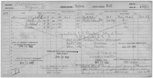 | Keywords: Enrollment for Cherokee Census Card D237 - NARA - 251985.tif Local identifier 75-53A-CHEROKEE D237 Department of the Interior Office of Indian Affairs Office of the Commissioner to the Five Civilized Tribes 1893 - 1914 NARA's Southwest Region Fort Worth NRFA 1400 John Burgess Drive Fort Worth TX 76140 Record group Record Group 75 Records of the Bureau of Indian Affairs 1793 - 1999 Record group ARC 404 Enrollment Cards compiled 1898 - 1914 Series ARC 251747 Variant control numbers NAIL Control Number NRFF-75-53A-1114<br /> NAIL Control Number NRFF-75-53A-1115<br /> NAIL Control Number NRFF-75-53A-1116<br /> NAIL Control Number NRFF-75-53A-1117<br /> NAIL Control Number NRFF-75-53A-1118<br /> NAIL Control Number NRFF-75-53A-3883<br /> NAIL Control Number NRFF-75-53A-3886<br /> NAIL Control Number NRFF-75-53A-CHEROKEE D237 General notes Scope and content Name Carleton Barnwell Type Doubtful Age 12 Sex Male Degree Indian Blood 1/64 City of Residence Wagoner Name Elizabeth S Barnwell Type Doubtful Age 43 Sex Female Degree Indian Blood 1/32 City of Residence Wagoner Name Middleton Barnwell Type Doubtful Age 18 Sex Male Degree Indian Blood 1/64 City of Residence Wagoner Name Stephen Barnwell Type Doubtful Age 20 Sex Male Degree Indian Blood 1/64 City of Residence Wagoner Name Stephen E Barnwell Type Parent Sex Male Name George W Cleland Type Parent Sex Male Name Mary Cleland Type Parent Sex Female File unit File unit ARC yes <gallery> File Enrollment_for_Cherokee_Census_Card_D237_-_NARA_-_251985 tif tif File Enrollment_for_Cherokee_Census_Card_D237_-_NARA_-_251985 jpg jpg </gallery> NARA-cooperation PD-USGov Cherokee census cards NARA TIF images with categorized JPGs |