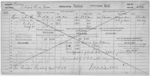 | Keywords: Enrollment for Cherokee Census Card D379 - NARA - 252127.jpg Scope and content Name John W Horn Type Doubtful Age 45 Sex Male Degree Indian Blood 1/8 Roll Number Not Reported Post Office Chapel Hill TX Name Pearl M Horn Type Doubtful Age 15 Sex Female Degree Indian Blood 1/16 Roll Number Not Reported Post Office Chapel Hill TX Name Ruby L Horn Type Doubtful Age 7 Sex Female Degree Indian Blood 1/16 Roll Number Not Reported Post Office Chapel Hill TX Name Mary M Horn Type Doubtful Age 5 Sex Female Degree Indian Blood 1/16 Roll Number Not Reported Post Office Chapel Hill TX General notes 252127 Local identifier 75-53A-CHEROKEE D379 Department of the Interior Office of Indian Affairs Office of the Commissioner to the Five Civilized Tribes 1893 - 1914 NARA's Southwest Region Fort Worth NRFA 1400 John Burgess Drive Fort Worth TX 76140 Record group Record Group 75 Records of the Bureau of Indian Affairs 1793 - 1999 Record group ARC 404 Enrollment Cards compiled 1898 - 1914 Series ARC 251747 File unit File unit ARC Variant control numbers NAIL Control Number NRFF-75-53A-53358<br /> NAIL Control Number NRFF-75-53A-53359<br /> NAIL Control Number NRFF-75-53A-53360<br /> NAIL Control Number NRFF-75-53A-53361<br /> NAIL Control Number NRFF-75-53A-CHEROKEE D379 Other versions <gallery> File Enrollment_for_Cherokee_Census_Card_D379_-_NARA_-_252127 tif tif File Enrollment_for_Cherokee_Census_Card_D379_-_NARA_-_252127 jpg jpg </gallery> NARA-cooperation PD-USGov Cherokee census cards |