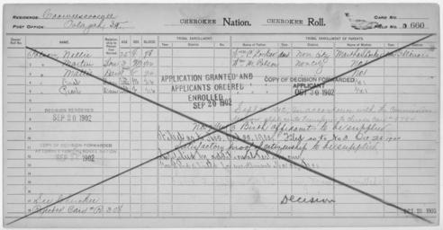 | Keywords: Enrollment for Cherokee Census Card D660 - NARA - 252408.jpg Scope and content Name Nellie Polson Type Doubtful Age 25 Sex Female Degree Indian Blood 1/8 Roll Number Not Reported Post Office Oolagah Name Martin Polson Type Doubtful Age 3 Sex Male Degree Indian Blood 1/16 Roll Number Not Reported Post Office Oolagah Name Mattie Polson Type Doubtful Age 1 Sex Female Degree Indian Blood 1/16 Roll Number Not Reported Post Office Oolagah Name Earl Polson Type Doubtful Age 1 Sex Male Degree Indian Blood 1/16 Roll Number Not Reported Post Office Oolagah Name Pearl Polson Type Doubtful Age 1 Sex Female Degree Indian Blood 1/16 Roll Number Not Reported Post Office Oolagah Name William C Locker Type Parent Age Not Reported Sex Male Degree Indian Blood Not Reported Roll Number Not Reported Post Office Not Reported Name William M Polson Type Parent Age Not Reported Sex Male Degree Indian Blood Not Reported Roll Number Not Reported Post Office Not Reported Name Martha S Locker Type Parent Age Not Reported Sex Female Degree Indian Blood Not Reported Roll Number Not Reported Post Office Not Reported General notes 252408 Local identifier 75-53A-CHEROKEE D660 Department of the Interior Office of Indian Affairs Office of the Commissioner to the Five Civilized Tribes 1893 - 1914 NARA's Southwest Region Fort Worth NRFA 1400 John Burgess Drive Fort Worth TX 76140 Record group Record Group 75 Records of the Bureau of Indian Affairs 1793 - 1999 Record group ARC 404 Enrollment Cards compiled 1898 - 1914 Series ARC 251747 File unit File unit ARC Variant control numbers NAIL Control Number NRFF-75-53A-54678<br /> NAIL Control Number NRFF-75-53A-54679<br /> NAIL Control Number NRFF-75-53A-54680<br /> NAIL Control Number NRFF-75-53A-54681<br /> NAIL Control Number NRFF-75-53A-54682<br /> NAIL Control Number NRFF-75-53A-54683<br /> NAIL Control Number NRFF-75-53A-54684<br /> NAIL Control Number NRFF-75-53A-54685<br /> NAIL Control Number NRFF-75-53A-CHEROKEE D660 Other versions <gallery> File Enrollment_for_Cherokee_Census_Card_D660_-_NARA_-_252408 tif tif File Enrollment_for_Cherokee_Census_Card_D660_-_NARA_-_252408 jpg jpg </gallery> NARA-cooperation PD-USGov Cherokee census cards |