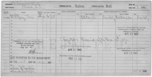 | Keywords: Enrollment for Cherokee Census Card R180 - NARA - 259243.jpg Scope and content Name Bill Edmisten Type Parent Sex Male Name Mat Edmisten Type Parent Sex Female Name Ada McAffrey Type Rejected Age 20 Sex Female Degree Indian Blood Intermarried White City of Residence Klaus General notes 259243 Local identifier 75-53A-CHEROKEE R180 Department of the Interior Office of Indian Affairs Office of the Commissioner to the Five Civilized Tribes 1893 - 1914 NARA's Southwest Region Fort Worth NRFA 1400 John Burgess Drive Fort Worth TX 76140 Record group Record Group 75 Records of the Bureau of Indian Affairs 1793 - 1999 Record group ARC 404 Enrollment Cards compiled 1898 - 1914 Series ARC 251747 File unit File unit ARC Variant control numbers NAIL Control Number NRFF-75-53A-12459<br /> NAIL Control Number NRFF-75-53A-5914<br /> NAIL Control Number NRFF-75-53A-5915<br /> NAIL Control Number NRFF-75-53A-CHEROKEE R180 Other versions <gallery> File Enrollment_for_Cherokee_Census_Card_R180_-_NARA_-_259243 tif tif File Enrollment_for_Cherokee_Census_Card_R180_-_NARA_-_259243 jpg jpg </gallery> NARA-cooperation PD-USGov Cherokee census cards |