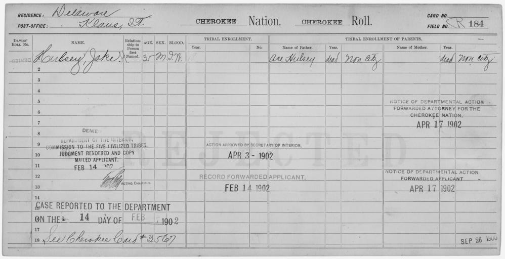 Keywords: Enrollment for Cherokee Census Card R184 - NARA - 259247.jpg Scope and content Name Ace Hulsey Type Parent Sex Male Name Jake H Hulsey Type Rejected Age 35 Sex Male Degree Indian Blood Intermarried White City of Residence Klaus General notes 259247 Local identifier 75-53A-CHEROKEE R184 Department of the Interior Office of Indian Affairs Office of the Commissioner to the Five Civilized Tribes 1893 - 1914 NARA's Southwest Region Fort Worth NRFA 1400 John Burgess Drive Fort Worth TX 76140 Record group Record Group 75 Records of the Bureau of Indian Affairs 1793 - 1999 Record group ARC 404 Enrollment Cards compiled 1898 - 1914 Series ARC 251747 File unit File unit ARC Variant control numbers NAIL Control Number NRFF-75-53A-9400<br /> NAIL Control Number NRFF-75-53A-9405<br /> NAIL Control Number NRFF-75-53A-CHEROKEE R184 Other versions <gallery> File Enrollment_for_Cherokee_Census_Card_R184_-_NARA_-_259247 tif tif File Enrollment_for_Cherokee_Census_Card_R184_-_NARA_-_259247 jpg jpg </gallery> NARA-cooperation PD-USGov Cherokee census cards |