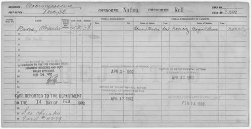 | Keywords: Enrollment for Cherokee Census Card R242 - NARA - 259305.jpg Scope and content Name Alexander Boone Type Rejected Age 25 Sex Male Degree Indian Blood Intermarried White City of Residence Vera Name Edward Boone Type Parent Sex Male Name Georgia Boone Type Parent Sex Female General notes 259305 Local identifier 75-53A-CHEROKEE R242 Department of the Interior Office of Indian Affairs Office of the Commissioner to the Five Civilized Tribes 1893 - 1914 NARA's Southwest Region Fort Worth NRFA 1400 John Burgess Drive Fort Worth TX 76140 Record group Record Group 75 Records of the Bureau of Indian Affairs 1793 - 1999 Record group ARC 404 Enrollment Cards compiled 1898 - 1914 Series ARC 251747 File unit File unit ARC Variant control numbers NAIL Control Number NRFF-75-53A-2045<br /> NAIL Control Number NRFF-75-53A-2046<br /> NAIL Control Number NRFF-75-53A-2047<br /> NAIL Control Number NRFF-75-53A-CHEROKEE R242 Other versions <gallery> File Enrollment_for_Cherokee_Census_Card_R242_-_NARA_-_259305 tif tif File Enrollment_for_Cherokee_Census_Card_R242_-_NARA_-_259305 jpg jpg </gallery> NARA-cooperation PD-USGov Cherokee census cards |