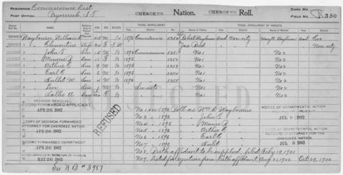 | Keywords: Enrollment for Cherokee Census Card R350 - NARA - 259413.jpg Scope and content Name James Reed Type Parent Sex Male Name Arthur C Waybourn Type Rejected Age 9 Sex Male Degree Indian Blood 1/8 City of Residence Pryorcreek Name Clementine Waybourn Type Rejected Age 34 Sex Female Degree Indian Blood Intermarried White City of Residence Pryorcreek Name Earl C Waybourn Type Rejected Age 9 Sex Male Degree Indian Blood 1/8 City of Residence Pryorcreek Name Hullet M Waybourn Type Rejected Age 4 Sex Male Degree Indian Blood 1/8 City of Residence Pryorcreek Name John T Waybourn Type Rejected Age 15 Sex Male Degree Indian Blood 1/8 City of Residence Pryorcreek Name Levi Waybourn Type Rejected Age 1 Sex Male Degree Indian Blood 1/8 City of Residence Pryorcreek Name Mary A Waybourn Type Parent Sex Female Name Minnie B Waybourn Type Rejected Age 11 Sex Female Degree Indian Blood 1/8 City of Residence Pryorcreek Name Robert Waybourn Type Parent Sex Male Name Sallie A Waybourn Type Rejected Age 1 Sex Female Degree Indian Blood 1/8 City of Residence Pryorcreek Name William D Waybourn Type Rejected Age 45 Sex Male Degree Indian Blood 1/4 City of Residence Pryorcreek General notes 259413 Local identifier 75-53A-CHEROKEE R350 Department of the Interior Office of Indian Affairs Office of the Commissioner to the Five Civilized Tribes 1893 - 1914 NARA's Southwest Region Fort Worth NRFA 1400 John Burgess Drive Fort Worth TX 76140 Record group Record Group 75 Records of the Bureau of Indian Affairs 1793 - 1999 Record group ARC 404 Enrollment Cards compiled 1898 - 1914 Series ARC 251747 File unit File unit ARC Variant control numbers NAIL Control Number NRFF-75-53A-15597<br /> NAIL Control Number NRFF-75-53A-20925<br /> NAIL Control Number NRFF-75-53A-20927<br /> NAIL Control Number NRFF-75-53A-20928<br /> NAIL Control Number NRFF-75-53A-20931<br /> NAIL Control Number NRFF-75-53A-20933<br /> NAIL Control Number NRFF-75-53A-20934<br /> NAIL Control Number NRFF-75-53A-20935<br /> NAIL Control Number NRFF-75-53A-20936<br /> NAIL Control Number NRFF-75-53A-20937<br /> NAIL Control Number NRFF-75-53A-20939<br /> NAIL Control Number NRFF-75-53A-20941<br /> NAIL Control Number NRFF-75-53A-CHEROKEE R350 Other versions <gallery> File Enrollment_for_Cherokee_Census_Card_R350_-_NARA_-_259413 tif tif File Enrollment_for_Cherokee_Census_Card_R350_-_NARA_-_259413 jpg jpg </gallery> NARA-cooperation PD-USGov Cherokee census cards |