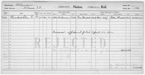 | Keywords: Enrollment for Cherokee Census Card R750 - NARA - 259813.jpg Scope and content Name Ellen Woodall Type Parent Sex Female Name George Woodall Type Parent Sex Male Name Stan G Woodall Type Rejected Age 47 Sex Male Degree Indian Blood 1/2 City of Residence Klaus General notes 259813 Local identifier 75-53A-CHEROKEE R750 Department of the Interior Office of Indian Affairs Office of the Commissioner to the Five Civilized Tribes 1893 - 1914 NARA's Southwest Region Fort Worth NRFA 1400 John Burgess Drive Fort Worth TX 76140 Record group Record Group 75 Records of the Bureau of Indian Affairs 1793 - 1999 Record group ARC 404 Enrollment Cards compiled 1898 - 1914 Series ARC 251747 File unit File unit ARC Variant control numbers NAIL Control Number NRFF-75-53A-22313<br /> NAIL Control Number NRFF-75-53A-22316<br /> NAIL Control Number NRFF-75-53A-22331<br /> NAIL Control Number NRFF-75-53A-CHEROKEE R750 Other versions <gallery> File Enrollment_for_Cherokee_Census_Card_R750_-_NARA_-_259813 tif tif File Enrollment_for_Cherokee_Census_Card_R750_-_NARA_-_259813 jpg jpg </gallery> NARA-cooperation PD-USGov Cherokee census cards |