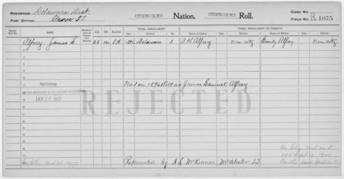 | Keywords: Enrollment for Cherokee Census Card R1075 - NARA - 260138.jpg Scope and content Name A H Alfrey Type Parent Sex Male Name Emily Alfrey Type Parent Sex Female Name James S Alfrey Type Rejected Age 38 Sex Male Degree Indian Blood Intermarried White City of Residence Grove General notes 260138 Local identifier 75-53A-CHEROKEE R1075 Department of the Interior Office of Indian Affairs Office of the Commissioner to the Five Civilized Tribes 1893 - 1914 NARA's Southwest Region Fort Worth NRFA 1400 John Burgess Drive Fort Worth TX 76140 Record group Record Group 75 Records of the Bureau of Indian Affairs 1793 - 1999 Record group ARC 404 Enrollment Cards compiled 1898 - 1914 Series ARC 251747 File unit File unit ARC Variant control numbers NAIL Control Number NRFF-75-53A-363<br /> NAIL Control Number NRFF-75-53A-364<br /> NAIL Control Number NRFF-75-53A-367<br /> NAIL Control Number NRFF-75-53A-CHEROKEE R1075 Other versions <gallery> File Enrollment_for_Cherokee_Census_Card_R1075_-_NARA_-_260138 tif tif File Enrollment_for_Cherokee_Census_Card_R1075_-_NARA_-_260138 jpg jpg </gallery> NARA-cooperation PD-USGov Cherokee census cards |