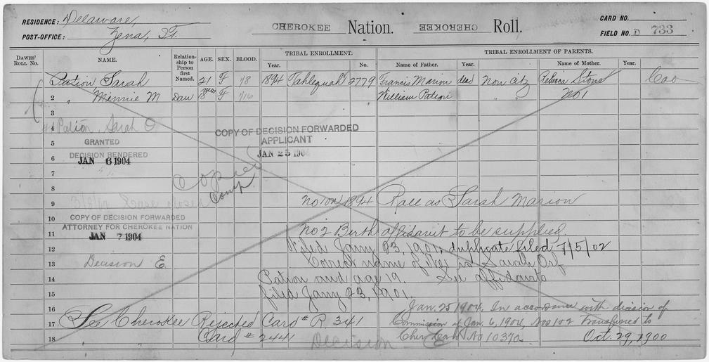 | Keywords: Enrollment for Cherokee Census Card D733 - NARA - 252481.tif Local identifier 75-53A-CHEROKEE D733 Department of the Interior Office of Indian Affairs Office of the Commissioner to the Five Civilized Tribes 1893 - 1914 NARA's Southwest Region Fort Worth NRFA 1400 John Burgess Drive Fort Worth TX 76140 Record group Record Group 75 Records of the Bureau of Indian Affairs 1793 - 1999 Record group ARC 404 Enrollment Cards compiled 1898 - 1914 Series ARC 251747 Variant control numbers NAIL Control Number NRFF-75-53A-55028<br /> NAIL Control Number NRFF-75-53A-55029<br /> NAIL Control Number NRFF-75-53A-55030<br /> NAIL Control Number NRFF-75-53A-55031<br /> NAIL Control Number NRFF-75-53A-55032<br /> NAIL Control Number NRFF-75-53A-CHEROKEE D733 General notes Scope and content Name Sarah Pation Type Doubtful Age 21 Sex Female Degree Indian Blood 1/8 Roll Number Not Reported Post Office Zena Name Minnie M Pation Type Doubtful Age 2 Sex Female Degree Indian Blood 1/16 Roll Number Not Reported Post Office Zena Name Francis Marion Type Parent Age Not Reported Sex Male Degree Indian Blood Not Reported Roll Number Not Reported Post Office Not Reported Name William Pation Type Parent Age Not Reported Sex Male Degree Indian Blood Not Reported Roll Number Not Reported Post Office Not Reported Name Rebecca Stone Type Parent Age Not Reported Sex Female Degree Indian Blood Not Reported Roll Number Not Reported Post Office Not Reported File unit File unit ARC yes <gallery> File Enrollment_for_Cherokee_Census_Card_D733_-_NARA_-_252481 tif tif File Enrollment_for_Cherokee_Census_Card_D733_-_NARA_-_252481 jpg jpg </gallery> NARA-cooperation PD-USGov Cherokee census cards NARA TIF images with categorized JPGs |