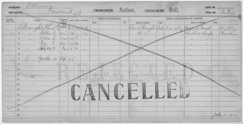 | Keywords: Enrollment for Cherokee Census Card R7 - NARA - 259070.tif Scope and content Name Cloud G Braught Type Rejected Age 60 Sex Male Degree Indian Blood 1/16 City of Residence Fairland Name Cynthia A Braught Type Rejected Age 37 City of Residence Fairland Name Cynthia A Braught Type Parent Sex Female Name David Braught Type Parent Sex Male Name Della S Braught Type Rejected Age 14 Sex Female Degree Indian Blood 1/16 City of Residence Fairland Name Margaret Braught Type Parent Sex Female Name Roy T Braught Type Rejected Age 10 Sex Male Degree Indian Blood 1/16 City of Residence Fairland Name Sizetta C Braught Type Rejected Age 6 Sex Female Degree Indian Blood 1/16 City of Residence Fairland Name Willie C Braught Type Rejected Age 16 Sex Male Degree Indian Blood 1/16 City of Residence Fairland General notes 259070 Local identifier 75-53A-CHEROKEE R7 Department of the Interior Office of Indian Affairs Office of the Commissioner to the Five Civilized Tribes 1893 - 1914 NARA's Southwest Region Fort Worth NRFA 1400 John Burgess Drive Fort Worth TX 76140 Record group Record Group 75 Records of the Bureau of Indian Affairs 1793 - 1999 Record group ARC 404 Enrollment Cards compiled 1898 - 1914 Series ARC 251747 File unit File unit ARC Variant control numbers NAIL Control Number NRFF-75-53A-2258<br /> NAIL Control Number NRFF-75-53A-2259<br /> NAIL Control Number NRFF-75-53A-2260<br /> NAIL Control Number NRFF-75-53A-2261<br /> NAIL Control Number NRFF-75-53A-2262<br /> NAIL Control Number NRFF-75-53A-2263<br /> NAIL Control Number NRFF-75-53A-2264<br /> NAIL Control Number NRFF-75-53A-2265<br /> NAIL Control Number NRFF-75-53A-2266<br /> NAIL Control Number NRFF-75-53A-CHEROKEE R7 yes Other versions <gallery> File Enrollment_for_Cherokee_Census_Card_R7_-_NARA_-_259070 tif tif File Enrollment_for_Cherokee_Census_Card_R7_-_NARA_-_259070 jpg jpg </gallery> NARA-cooperation PD-USGov Cherokee census cards NARA TIF images with categorized JPGs |