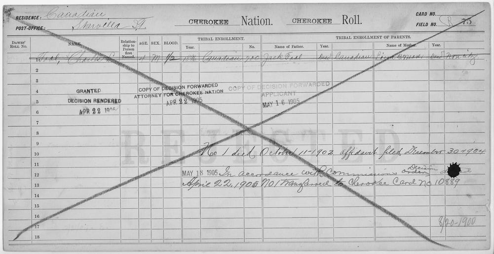 | Keywords: Enrollment for Cherokee Census Card R75 - NARA - 259138.tif Scope and content Name Charles L Fool Type Rejected Age 4 Sex Male Degree Indian Blood 1/2 City of Residence Starvilla Name Jack Fool Type Parent Sex Male Name Lina B Weaver Type Parent Sex Female General notes 259138 Local identifier 75-53A-CHEROKEE R75 Department of the Interior Office of Indian Affairs Office of the Commissioner to the Five Civilized Tribes 1893 - 1914 NARA's Southwest Region Fort Worth NRFA 1400 John Burgess Drive Fort Worth TX 76140 Record group Record Group 75 Records of the Bureau of Indian Affairs 1793 - 1999 Record group ARC 404 Enrollment Cards compiled 1898 - 1914 Series ARC 251747 File unit File unit ARC Variant control numbers NAIL Control Number NRFF-75-53A-20980<br /> NAIL Control Number NRFF-75-53A-6654<br /> NAIL Control Number NRFF-75-53A-6655<br /> NAIL Control Number NRFF-75-53A-CHEROKEE R75 yes Other versions <gallery> File Enrollment_for_Cherokee_Census_Card_R75_-_NARA_-_259138 tif tif File Enrollment_for_Cherokee_Census_Card_R75_-_NARA_-_259138 jpg jpg </gallery> NARA-cooperation PD-USGov Cherokee census cards NARA TIF images with categorized JPGs |