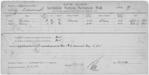 | Keywords: Enrollment for Seminole Census Card 99 - NARA - 267673.tif Scope and content Name Chepan Chupco Type Parent Sex Male City of Residence k Name Dicey Harjo Type By Blood Age 30 Sex Female Degree Indian Blood Full Roll Number 347 City of Residence k Name Thle Harjo Type By Blood Age 43 Sex Male Degree Indian Blood 1/2 Roll Number 346 City of Residence nh Name Henista Type By Blood Age 25 Sex Male Degree Indian Blood Full City of Residence k Name Kochupna Type Parent Sex Male City of Residence nh Name Lizzie Type Parent Sex Female City of Residence k Name Milley Type Parent Sex Female City of Residence k Name Turner Wolf Type By Blood Age 8 Sex Male Degree Indian Blood Full Roll Number 348 City of Residence nh Name Hosia Yahola Type Parent Sex Male City of Residence Creek Name Willie Type Newborn Age 3 Sex Male Degree Indian Blood 3/4 Roll Number 124 Post Office Tidmore Name Mary Type Newborn Age 1 Sex Female Degree Indian Blood 3/4 Roll Number 125 Post Office Tidmore General notes 267673 Local identifier 75-53A-SEMINOLE 99 Department of the Interior Office of Indian Affairs Office of the Commissioner to the Five Civilized Tribes 1893 - 1914 NARA's Southwest Region Fort Worth NRFA 1400 John Burgess Drive Fort Worth TX 76140 Record group Record Group 75 Records of the Bureau of Indian Affairs 1793 - 1999 Record group ARC 404 Enrollment Cards compiled 1898 - 1914 Series ARC 251747 File unit File unit ARC Variant control numbers NAIL Control Number NRFF-75-53A-28062<br /> NAIL Control Number NRFF-75-53A-34278<br /> NAIL Control Number NRFF-75-53A-35121<br /> NAIL Control Number NRFF-75-53A-36025<br /> NAIL Control Number NRFF-75-53A-38885<br /> NAIL Control Number NRFF-75-53A-39654<br /> NAIL Control Number NRFF-75-53A-42148<br /> NAIL Control Number NRFF-75-53A-51902<br /> NAIL Control Number NRFF-75-53A-52138<br /> NAIL Control Number NRFF-75-53A-52666<br /> NAIL Control Number NRFF-75-53A-52667<br /> NAIL Control Number NRFF-75-53A-SEMINOLE 99 yes Other versions <gallery> File Enrollment_for_Seminole_Census_Card_99_-_NARA_-_267673 tif tif File Enrollment_for_Seminole_Census_Card_99_-_NARA_-_267673 jpg jpg </gallery> NARA-cooperation PD-USGov Cherokee census cards NARA TIF images with categorized JPGs |