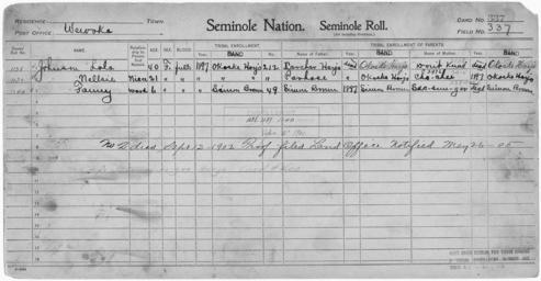 | Keywords: Enrollment for Seminole Census Card 337 - NARA - 267911.tif Scope and content Name Simon Brown Type Parent Sex Male City of Residence sb Name Chochee Type Parent Sex Female City of Residence oh Name Carcher Harjo Type Parent Sex Male City of Residence oh Name Fanny Johnson Type By Blood Age 6 Sex Female Degree Indian Blood Full Roll Number 1140 City of Residence sb Name Lola Johnson Type By Blood Age 40 Sex Female Degree Indian Blood Full Roll Number 1138 City of Residence oh Name Nellsie Johnson Type By Blood Age 21 Sex Female Degree Indian Blood Full Roll Number 1139 City of Residence oh Name Parhose Type Parent Sex Male City of Residence oh Name Sacsunger Type Parent Sex Female City of Residence sb General notes 267911 Local identifier 75-53A-SEMINOLE 337 Department of the Interior Office of Indian Affairs Office of the Commissioner to the Five Civilized Tribes 1893 - 1914 NARA's Southwest Region Fort Worth NRFA 1400 John Burgess Drive Fort Worth TX 76140 Record group Record Group 75 Records of the Bureau of Indian Affairs 1793 - 1999 Record group ARC 404 Enrollment Cards compiled 1898 - 1914 Series ARC 251747 File unit File unit ARC Variant control numbers NAIL Control Number NRFF-75-53A-25954<br /> NAIL Control Number NRFF-75-53A-27948<br /> NAIL Control Number NRFF-75-53A-34146<br /> NAIL Control Number NRFF-75-53A-37808<br /> NAIL Control Number NRFF-75-53A-37878<br /> NAIL Control Number NRFF-75-53A-37914<br /> NAIL Control Number NRFF-75-53A-43567<br /> NAIL Control Number NRFF-75-53A-45527<br /> NAIL Control Number NRFF-75-53A-SEMINOLE 337 yes Other versions <gallery> File Enrollment_for_Seminole_Census_Card_337_-_NARA_-_267911 tif tif File Enrollment_for_Seminole_Census_Card_337_-_NARA_-_267911 jpg jpg </gallery> NARA-cooperation PD-USGov Seminole census cards NARA TIF images with categorized JPGs |