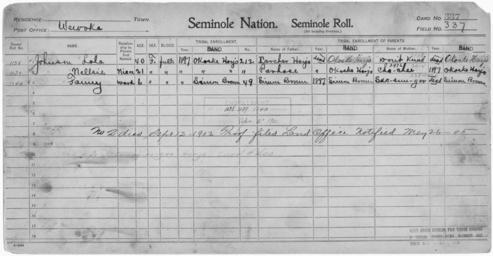 | Keywords: Enrollment for Seminole Census Card 337 - NARA - 267911.jpg Scope and content Name Simon Brown Type Parent Sex Male City of Residence sb Name Chochee Type Parent Sex Female City of Residence oh Name Carcher Harjo Type Parent Sex Male City of Residence oh Name Fanny Johnson Type By Blood Age 6 Sex Female Degree Indian Blood Full Roll Number 1140 City of Residence sb Name Lola Johnson Type By Blood Age 40 Sex Female Degree Indian Blood Full Roll Number 1138 City of Residence oh Name Nellsie Johnson Type By Blood Age 21 Sex Female Degree Indian Blood Full Roll Number 1139 City of Residence oh Name Parhose Type Parent Sex Male City of Residence oh Name Sacsunger Type Parent Sex Female City of Residence sb General notes 267911 Local identifier 75-53A-SEMINOLE 337 Department of the Interior Office of Indian Affairs Office of the Commissioner to the Five Civilized Tribes 1893 - 1914 NARA's Southwest Region Fort Worth NRFA 1400 John Burgess Drive Fort Worth TX 76140 Record group Record Group 75 Records of the Bureau of Indian Affairs 1793 - 1999 Record group ARC 404 Enrollment Cards compiled 1898 - 1914 Series ARC 251747 File unit File unit ARC Variant control numbers NAIL Control Number NRFF-75-53A-25954<br /> NAIL Control Number NRFF-75-53A-27948<br /> NAIL Control Number NRFF-75-53A-34146<br /> NAIL Control Number NRFF-75-53A-37808<br /> NAIL Control Number NRFF-75-53A-37878<br /> NAIL Control Number NRFF-75-53A-37914<br /> NAIL Control Number NRFF-75-53A-43567<br /> NAIL Control Number NRFF-75-53A-45527<br /> NAIL Control Number NRFF-75-53A-SEMINOLE 337 Other versions <gallery> File Enrollment_for_Seminole_Census_Card_337_-_NARA_-_267911 tif tif File Enrollment_for_Seminole_Census_Card_337_-_NARA_-_267911 jpg jpg </gallery> NARA-cooperation PD-USGov Seminole census cards |