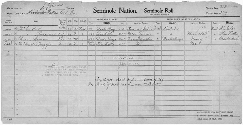 Keywords: Enrollment for Seminole Census Card 339 - NARA - 267913.jpg Scope and content Name Simon Bear Type By Blood Age 12 Sex Male Degree Indian Blood Full Roll Number 1146 City of Residence oh Name Nocas Emarther Type Parent Sex Male City of Residence oh Name Henneo Fixico Type Parent Sex Male City of Residence k Name Nocas Fixico Type Parent Sex Male City of Residence k Name McCulla Type By Blood Age 28 Sex Male Degree Indian Blood Full Roll Number 1144 City of Residence oh Name Maggie McCulla Type By Blood Age 1 Sex Female Degree Indian Blood Full City of Residence tl Name Rosanna McCulla Type By Blood Age 27 Sex Female Degree Indian Blood Full Roll Number 1145 City of Residence tl Name Monacher Type Parent Sex Female City of Residence tl General notes 267913 Local identifier 75-53A-SEMINOLE 339 Department of the Interior Office of Indian Affairs Office of the Commissioner to the Five Civilized Tribes 1893 - 1914 NARA's Southwest Region Fort Worth NRFA 1400 John Burgess Drive Fort Worth TX 76140 Record group Record Group 75 Records of the Bureau of Indian Affairs 1793 - 1999 Record group ARC 404 Enrollment Cards compiled 1898 - 1914 Series ARC 251747 File unit File unit ARC Variant control numbers NAIL Control Number NRFF-75-53A-24317<br /> NAIL Control Number NRFF-75-53A-30876<br /> NAIL Control Number NRFF-75-53A-31907<br /> NAIL Control Number NRFF-75-53A-31997<br /> NAIL Control Number NRFF-75-53A-41005<br /> NAIL Control Number NRFF-75-53A-41008<br /> NAIL Control Number NRFF-75-53A-41011<br /> NAIL Control Number NRFF-75-53A-42399<br /> NAIL Control Number NRFF-75-53A-SEMINOLE 339 Other versions <gallery> File Enrollment_for_Seminole_Census_Card_339_-_NARA_-_267913 tif tif File Enrollment_for_Seminole_Census_Card_339_-_NARA_-_267913 jpg jpg </gallery> NARA-cooperation PD-USGov Seminole census cards |