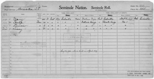 | Keywords: Enrollment for Seminole Census Card 355 - NARA - 267929.jpg Scope and content Name Nokus Fife Type Parent Sex Male City of Residence e Name Nokus Harjo Type Parent Sex Male City of Residence oh Name Louisa Type By Blood Age 9 Sex Female Degree Indian Blood Full Roll Number 1200 City of Residence e Name Mary Type By Blood Age 44 Sex Female Degree Indian Blood Full Roll Number 1198 City of Residence e Name Sissy Type By Blood Age 4 Sex Female Degree Indian Blood Full City of Residence e Name Toche Type By Blood Age 10 Sex Female Degree Indian Blood Full Roll Number 1199 City of Residence e General notes 267929 Local identifier 75-53A-SEMINOLE 355 Department of the Interior Office of Indian Affairs Office of the Commissioner to the Five Civilized Tribes 1893 - 1914 NARA's Southwest Region Fort Worth NRFA 1400 John Burgess Drive Fort Worth TX 76140 Record group Record Group 75 Records of the Bureau of Indian Affairs 1793 - 1999 Record group ARC 404 Enrollment Cards compiled 1898 - 1914 Series ARC 251747 File unit File unit ARC Variant control numbers NAIL Control Number NRFF-75-53A-31526<br /> NAIL Control Number NRFF-75-53A-34870<br /> NAIL Control Number NRFF-75-53A-39935<br /> NAIL Control Number NRFF-75-53A-40806<br /> NAIL Control Number NRFF-75-53A-47116<br /> NAIL Control Number NRFF-75-53A-49970<br /> NAIL Control Number NRFF-75-53A-SEMINOLE 355 Other versions <gallery> File Enrollment_for_Seminole_Census_Card_355_-_NARA_-_267929 tif tif File Enrollment_for_Seminole_Census_Card_355_-_NARA_-_267929 jpg jpg </gallery> NARA-cooperation PD-USGov Seminole census cards |