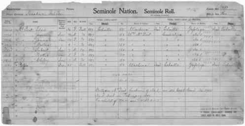 | Keywords: Enrollment for Seminole Census Card 360 - NARA - 267934.jpg Scope and content Name Chiley McGirt Type By Blood Age 1 Sex Male Degree Indian Blood 1/2 Roll Number 1219 City of Residence e Name Elsie McGirt Type By Blood Age 36 Sex Female Degree Indian Blood Full Roll Number 1214 City of Residence e Name Hettie McGirt Type By Blood Age 5 Sex Female Degree Indian Blood 1/2 Roll Number 1218 City of Residence e Name Jennah McGirt Type By Blood Age 12 Sex Female Degree Indian Blood 1/2 Roll Number 1216 City of Residence e Name Jimmy McGirt Type By Blood Age 16 Sex Male Degree Indian Blood 1/2 Roll Number 1215 City of Residence e Name Mollea McGirt Type By Blood Age 9 Sex Female Degree Indian Blood 1/2 Roll Number 1217 City of Residence e Name Sibert McGirt Type By Blood Age 7 Sex Male Degree Indian Blood 1/2 City of Residence e Name William McGirt Type Parent Sex Male City of Residence Creek Name Peter Type By Blood Age 25 Sex Male Degree Indian Blood Full Roll Number 1220 City of Residence e Name Wachena Type Parent Sex Male City of Residence e Name Yofolege Type Parent Sex Female City of Residence e General notes 267934 Local identifier 75-53A-SEMINOLE 360 Department of the Interior Office of Indian Affairs Office of the Commissioner to the Five Civilized Tribes 1893 - 1914 NARA's Southwest Region Fort Worth NRFA 1400 John Burgess Drive Fort Worth TX 76140 Record group Record Group 75 Records of the Bureau of Indian Affairs 1793 - 1999 Record group ARC 404 Enrollment Cards compiled 1898 - 1914 Series ARC 251747 File unit File unit ARC Variant control numbers NAIL Control Number NRFF-75-53A-41160<br /> NAIL Control Number NRFF-75-53A-41169<br /> NAIL Control Number NRFF-75-53A-41176<br /> NAIL Control Number NRFF-75-53A-41179<br /> NAIL Control Number NRFF-75-53A-41184<br /> NAIL Control Number NRFF-75-53A-41194<br /> NAIL Control Number NRFF-75-53A-41197<br /> NAIL Control Number NRFF-75-53A-41203<br /> NAIL Control Number NRFF-75-53A-44011<br /> NAIL Control Number NRFF-75-53A-50362<br /> NAIL Control Number NRFF-75-53A-52575<br /> NAIL Control Number NRFF-75-53A-SEMINOLE 360 Other versions <gallery> File Enrollment_for_Seminole_Census_Card_360_-_NARA_-_267934 tif tif File Enrollment_for_Seminole_Census_Card_360_-_NARA_-_267934 jpg jpg </gallery> NARA-cooperation PD-USGov Seminole census cards |