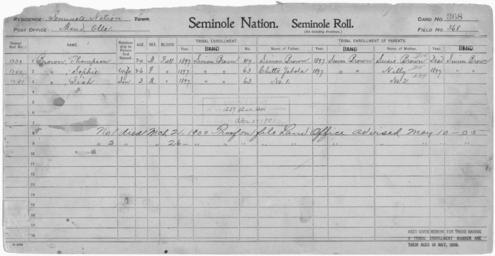 | Keywords: Enrollment for Seminole Census Card 368 - NARA - 267942.jpg Scope and content Name Siah Brown Type By Blood Age 3 Sex Male Degree Indian Blood Full Roll Number 1241 City of Residence sb Name Simon Brown Type Parent Sex Male City of Residence sb Name Sophie Brown Type By Blood Age 26 Sex Female Degree Indian Blood Full Roll Number 1240 City of Residence sb Name Susie Brown Type Parent Sex Female City of Residence sb Name Thompson Brown Type By Blood Age 20 Sex Male Degree Indian Blood Full Roll Number 1239 City of Residence sb Name Nilly Type Parent Sex Female City of Residence sb Name Chitto Yahola Type Parent Sex Male City of Residence sb General notes 267942 Local identifier 75-53A-SEMINOLE 368 Department of the Interior Office of Indian Affairs Office of the Commissioner to the Five Civilized Tribes 1893 - 1914 NARA's Southwest Region Fort Worth NRFA 1400 John Burgess Drive Fort Worth TX 76140 Record group Record Group 75 Records of the Bureau of Indian Affairs 1793 - 1999 Record group ARC 404 Enrollment Cards compiled 1898 - 1914 Series ARC 251747 File unit File unit ARC Variant control numbers NAIL Control Number NRFF-75-53A-25951<br /> NAIL Control Number NRFF-75-53A-25955<br /> NAIL Control Number NRFF-75-53A-25959<br /> NAIL Control Number NRFF-75-53A-25965<br /> NAIL Control Number NRFF-75-53A-25974<br /> NAIL Control Number NRFF-75-53A-43177<br /> NAIL Control Number NRFF-75-53A-52081<br /> NAIL Control Number NRFF-75-53A-SEMINOLE 368 Other versions <gallery> File Enrollment_for_Seminole_Census_Card_368_-_NARA_-_267942 tif tif File Enrollment_for_Seminole_Census_Card_368_-_NARA_-_267942 jpg jpg </gallery> NARA-cooperation PD-USGov Seminole census cards |