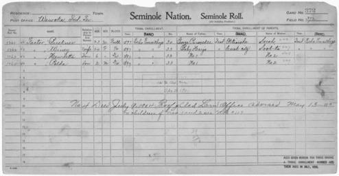 | Keywords: Enrollment for Seminole Census Card 372 - NARA - 267946.jpg Scope and content Name Buckner Factor Type By Blood Age 23 Sex Male Degree Indian Blood Full Roll Number 1261 City of Residence ee Name Henrietta Factor Type By Blood Age 6 Sex Female Degree Indian Blood 3/4 Roll Number 1263 City of Residence ee Name Polda Factor Type By Blood Age 2 Sex Male Degree Indian Blood 3/4 Roll Number 1264 City of Residence ee Name Winey Factor Type By Blood Age 20 Sex Female Degree Indian Blood 1/2 Roll Number 1262 City of Residence ee Name George Parsucker Type Parent Sex Male City of Residence o Name Sookta Type Parent Sex Female City of Residence ee General notes 267946 Local identifier 75-53A-SEMINOLE 372 Department of the Interior Office of Indian Affairs Office of the Commissioner to the Five Civilized Tribes 1893 - 1914 NARA's Southwest Region Fort Worth NRFA 1400 John Burgess Drive Fort Worth TX 76140 Record group Record Group 75 Records of the Bureau of Indian Affairs 1793 - 1999 Record group ARC 404 Enrollment Cards compiled 1898 - 1914 Series ARC 251747 File unit File unit ARC Variant control numbers NAIL Control Number NRFF-75-53A-31172<br /> NAIL Control Number NRFF-75-53A-31189<br /> NAIL Control Number NRFF-75-53A-31251<br /> NAIL Control Number NRFF-75-53A-31277<br /> NAIL Control Number NRFF-75-53A-43628<br /> NAIL Control Number NRFF-75-53A-47654<br /> NAIL Control Number NRFF-75-53A-SEMINOLE 372 Other versions <gallery> File Enrollment_for_Seminole_Census_Card_372_-_NARA_-_267946 tif tif File Enrollment_for_Seminole_Census_Card_372_-_NARA_-_267946 jpg jpg </gallery> NARA-cooperation PD-USGov Seminole census cards |