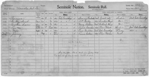 | Keywords: Enrollment for Seminole Census Card 383 - NARA - 267957.jpg Scope and content Name Louis Carcher Type Parent Sex Male City of Residence tp Name Louie Cotser Type Parent Sex Male City of Residence tp Name Sarah Cully Type By Blood Age 20 Sex Female Degree Indian Blood 3/4 Roll Number 1288 City of Residence ee Name William Cully Type Parent Sex Male City of Residence th Name Spanny Harlocko Type Parent Sex Male City of Residence Creek Name Jimmy Type By Blood Age 1 Sex Male Degree Indian Blood Full City of Residence ee Name Lowesa Type By Blood Age 20 Sex Female Degree Indian Blood Full Roll Number 1290 City of Residence ee Name Lucy Type Parent Sex Female City of Residence ee Name Fus Mekko Type Parent Sex Male City of Residence ee Name Melo Type By Blood Age 8 Sex Male Degree Indian Blood Full Roll Number 1291 City of Residence ee Name Rosanna Type By Blood Age 40 Sex Female Degree Indian Blood 1/2 Roll Number 1287 City of Residence ee Name Sudie Type Parent Sex Female City of Residence ee Name Marcy Walker Type Parent Sex Male City of Residence nh Name Seaver Walker Type By Blood Age 15 Sex Male Degree Indian Blood 3/4 Roll Number 1289 City of Residence ee General notes 267957 Local identifier 75-53A-SEMINOLE 383 Department of the Interior Office of Indian Affairs Office of the Commissioner to the Five Civilized Tribes 1893 - 1914 NARA's Southwest Region Fort Worth NRFA 1400 John Burgess Drive Fort Worth TX 76140 Record group Record Group 75 Records of the Bureau of Indian Affairs 1793 - 1999 Record group ARC 404 Enrollment Cards compiled 1898 - 1914 Series ARC 251747 File unit File unit ARC Variant control numbers NAIL Control Number NRFF-75-53A-27119<br /> NAIL Control Number NRFF-75-53A-28967<br /> NAIL Control Number NRFF-75-53A-29338<br /> NAIL Control Number NRFF-75-53A-29343<br /> NAIL Control Number NRFF-75-53A-35465<br /> NAIL Control Number NRFF-75-53A-37626<br /> NAIL Control Number NRFF-75-53A-40074<br /> NAIL Control Number NRFF-75-53A-40175<br /> NAIL Control Number NRFF-75-53A-41746<br /> NAIL Control Number NRFF-75-53A-41786<br /> NAIL Control Number NRFF-75-53A-45423<br /> NAIL Control Number NRFF-75-53A-48181<br /> NAIL Control Number NRFF-75-53A-50522<br /> NAIL Control Number NRFF-75-53A-50539<br /> NAIL Control Number NRFF-75-53A-SEMINOLE 383 Other versions <gallery> File Enrollment_for_Seminole_Census_Card_383_-_NARA_-_267957 tif tif File Enrollment_for_Seminole_Census_Card_383_-_NARA_-_267957 jpg jpg </gallery> NARA-cooperation PD-USGov Seminole census cards |