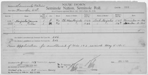 | Keywords: Enrollment for Seminole Census Card 112 - NARA - 267686.tif Scope and content Name Cowake Type By Blood Age 55 Sex Male Degree Indian Blood Full Roll Number 387 City of Residence k Name Martey Type Parent Sex Male City of Residence nh Name Octemehe Type Parent Sex Female City of Residence th Name Okfuska Type Parent Sex Male City of Residence yh Name Rhoda Type Parent Sex Female City of Residence sb Name Robert Type By Blood Age 18 Sex Male Degree Indian Blood Full Roll Number 389 City of Residence ee Name Simedihakee Type By Blood Age 33 Sex Female Degree Indian Blood Full Roll Number 388 City of Residence th Name Jennie Harjoche Type Newborn Age 1 Sex Female Degree Indian Blood 3/4 Roll Number 138 Post Office Wewoka Name Abler Harjoche Type Newborn Age 1 Sex Male Degree Indian Blood 3/4 Roll Number 215 Post Office Wewoka General notes 267686 Local identifier 75-53A-SEMINOLE 112 Department of the Interior Office of Indian Affairs Office of the Commissioner to the Five Civilized Tribes 1893 - 1914 NARA's Southwest Region Fort Worth NRFA 1400 John Burgess Drive Fort Worth TX 76140 Record group Record Group 75 Records of the Bureau of Indian Affairs 1793 - 1999 Record group ARC 404 Enrollment Cards compiled 1898 - 1914 Series ARC 251747 File unit File unit ARC Variant control numbers NAIL Control Number NRFF-75-53A-28986<br /> NAIL Control Number NRFF-75-53A-40718<br /> NAIL Control Number NRFF-75-53A-43360<br /> NAIL Control Number NRFF-75-53A-43379<br /> NAIL Control Number NRFF-75-53A-44990<br /> NAIL Control Number NRFF-75-53A-45179<br /> NAIL Control Number NRFF-75-53A-46856<br /> NAIL Control Number NRFF-75-53A-52685<br /> NAIL Control Number NRFF-75-53A-52686<br /> NAIL Control Number NRFF-75-53A-SEMINOLE 112 yes Other versions <gallery> File Enrollment_for_Seminole_Census_Card_112_-_NARA_-_267686 tif tif File Enrollment_for_Seminole_Census_Card_112_-_NARA_-_267686 jpg jpg </gallery> NARA-cooperation PD-USGov Cherokee census cards NARA TIF images with categorized JPGs |