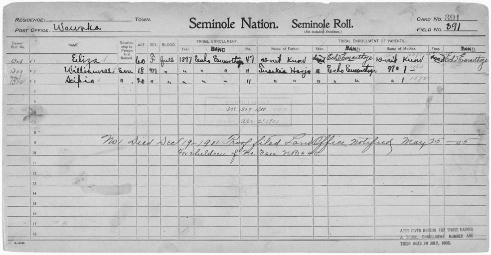 Keywords: Enrollment for Seminole Census Card 391 - NARA - 267965.jpg Scope and content Name Eliza Type By Blood Age 60 Sex Female Degree Indian Blood Full Roll Number 1308 City of Residence ee Name Tusekia Harjo Type Parent Sex Male City of Residence ee Name Scipio Type By Blood Age 20 Sex Male Degree Indian Blood Full Roll Number 1310 City of Residence ee Name Williamsee Type By Blood Age 18 Sex Male Degree Indian Blood Full Roll Number 1309 City of Residence ee General notes 267965 Local identifier 75-53A-SEMINOLE 391 Department of the Interior Office of Indian Affairs Office of the Commissioner to the Five Civilized Tribes 1893 - 1914 NARA's Southwest Region Fort Worth NRFA 1400 John Burgess Drive Fort Worth TX 76140 Record group Record Group 75 Records of the Bureau of Indian Affairs 1793 - 1999 Record group ARC 404 Enrollment Cards compiled 1898 - 1914 Series ARC 251747 File unit File unit ARC Variant control numbers NAIL Control Number NRFF-75-53A-30803<br /> NAIL Control Number NRFF-75-53A-35228<br /> NAIL Control Number NRFF-75-53A-46072<br /> NAIL Control Number NRFF-75-53A-51458<br /> NAIL Control Number NRFF-75-53A-SEMINOLE 391 Other versions <gallery> File Enrollment_for_Seminole_Census_Card_391_-_NARA_-_267965 tif tif File Enrollment_for_Seminole_Census_Card_391_-_NARA_-_267965 jpg jpg </gallery> NARA-cooperation PD-USGov Seminole census cards