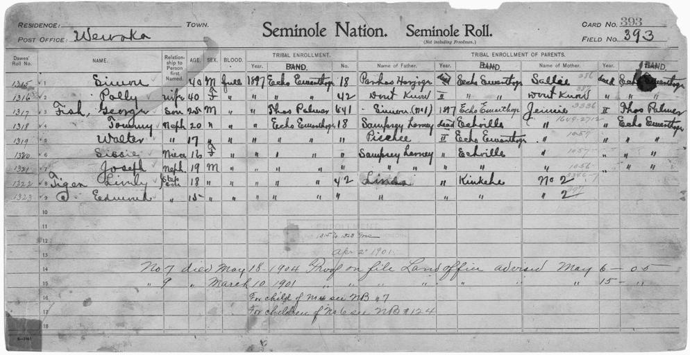 Keywords: Enrollment for Seminole Census Card 393 - NARA - 267967.jpg Scope and content Name Edward Type By Blood Age 15 Sex Male Degree Indian Blood Full Roll Number 1323 City of Residence ee Name George Fish Type By Blood Age 25 Sex Male Degree Indian Blood Full Roll Number 1317 City of Residence tp Name Parhos Harjoge Type Parent Sex Male City of Residence ee Name Joseph Type By Blood Age 19 Sex Male Degree Indian Blood Full Roll Number 1321 City of Residence ee Name Sampsey Larney Type Parent Sex Male City of Residence e Name Pischee Type Parent Sex Male City of Residence ee Name Polly Type By Blood Age 40 Sex Female Degree Indian Blood Full Roll Number 1316 City of Residence ee Name Simon Type By Blood Age 40 Sex Male Degree Indian Blood Full Roll Number 1315 City of Residence ee Name Sissie Type By Blood Age 16 Sex Female Degree Indian Blood Full Roll Number 1320 City of Residence ee Name Lively Tiger Type By Blood Age 18 Sex Male Degree Indian Blood Full Roll Number 1322 City of Residence ee Name Tommy Type By Blood Age 20 Sex Male Degree Indian Blood Full Roll Number 1318 City of Residence ee Name Wlater Type By Blood Age 17 Sex Male Degree Indian Blood Full Roll Number 1319 City of Residence ee General notes 267967 Local identifier 75-53A-SEMINOLE 393 Department of the Interior Office of Indian Affairs Office of the Commissioner to the Five Civilized Tribes 1893 - 1914 NARA's Southwest Region Fort Worth NRFA 1400 John Burgess Drive Fort Worth TX 76140 Record group Record Group 75 Records of the Bureau of Indian Affairs 1793 - 1999 Record group ARC 404 Enrollment Cards compiled 1898 - 1914 Series ARC 251747 File unit File unit ARC Variant control numbers NAIL Control Number NRFF-75-53A-30777<br /> NAIL Control Number NRFF-75-53A-31619<br /> NAIL Control Number NRFF-75-53A-35446<br /> NAIL Control Number NRFF-75-53A-38161<br /> NAIL Control Number NRFF-75-53A-39059<br /> NAIL Control Number NRFF-75-53A-44194<br /> NAIL Control Number NRFF-75-53A-44315<br /> NAIL Control Number NRFF-75-53A-46996<br /> NAIL Control Number NRFF-75-53A-47111<br /> NAIL Control Number NRFF-75-53A-49614<br /> NAIL Control Number NRFF-75-53A-50022<br /> NAIL Control Number NRFF-75-53A-51805<br /> NAIL Control Number NRFF-75-53A-SEMINOLE 393 Other versions <gallery> File Enrollment_for_Seminole_Census_Card_393_-_NARA_-_267967 tif tif File Enrollment_for_Seminole_Census_Card_393_-_NARA_-_267967 jpg jpg </gallery> NARA-cooperation PD-USGov Seminole census cards