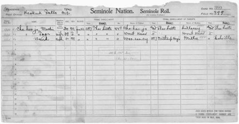 | Keywords: Enrollment for Seminole Census Card 399 - NARA - 267973.tif Scope and content Name Martin Choharjo Type By Blood Age 30 Sex Male Degree Indian Blood Full Roll Number 1333 City of Residence tl Name Toge Choharjo Type By Blood Age 39 Sex Female Degree Indian Blood Full Roll Number 1334 City of Residence tl Name David Type By Blood Age 5 Sex Male Degree Indian Blood Full Roll Number 1335 City of Residence tl Name Lillesey Type Parent Sex Female City of Residence tl Name Millie Type Parent Sex Female City of Residence e Name Warsarcy Type Parent Sex Male City of Residence nh General notes 267973 Local identifier 75-53A-SEMINOLE 399 Department of the Interior Office of Indian Affairs Office of the Commissioner to the Five Civilized Tribes 1893 - 1914 NARA's Southwest Region Fort Worth NRFA 1400 John Burgess Drive Fort Worth TX 76140 Record group Record Group 75 Records of the Bureau of Indian Affairs 1793 - 1999 Record group ARC 404 Enrollment Cards compiled 1898 - 1914 Series ARC 251747 File unit File unit ARC Variant control numbers NAIL Control Number NRFF-75-53A-27975<br /> NAIL Control Number NRFF-75-53A-27977<br /> NAIL Control Number NRFF-75-53A-29546<br /> NAIL Control Number NRFF-75-53A-39483<br /> NAIL Control Number NRFF-75-53A-42166<br /> NAIL Control Number NRFF-75-53A-50643<br /> NAIL Control Number NRFF-75-53A-SEMINOLE 399 yes Other versions <gallery> File Enrollment_for_Seminole_Census_Card_399_-_NARA_-_267973 tif tif File Enrollment_for_Seminole_Census_Card_399_-_NARA_-_267973 jpg jpg </gallery> NARA-cooperation PD-USGov Seminole census cards NARA TIF images with categorized JPGs |