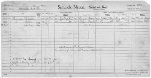 | Keywords: Enrollment for Seminole Census Card 403 - NARA - 267977.tif Scope and content Name Chepon Davis Type Parent Sex Male City of Residence tl Name Folee Type Parent Sex Female City of Residence tl Name Lucy Larney Type Parent Sex Female City of Residence oh Name Nelia Tanyan Type By Blood Age 1 Sex Male Degree Indian Blood Full Roll Number 1344 City of Residence tl Name Nina Tanyan Type By Blood Age 23 Sex Male Degree Indian Blood Full Roll Number 1342 City of Residence nh Name Sallie Tanyan Type By Blood Age 19 Sex Female Degree Indian Blood Full Roll Number 1343 City of Residence tl Name Tanyan Woxa Type Parent Sex Male City of Residence nh General notes 267977 Local identifier 75-53A-SEMINOLE 403 Department of the Interior Office of Indian Affairs Office of the Commissioner to the Five Civilized Tribes 1893 - 1914 NARA's Southwest Region Fort Worth NRFA 1400 John Burgess Drive Fort Worth TX 76140 Record group Record Group 75 Records of the Bureau of Indian Affairs 1793 - 1999 Record group ARC 404 Enrollment Cards compiled 1898 - 1914 Series ARC 251747 File unit File unit ARC Variant control numbers NAIL Control Number NRFF-75-53A-29612<br /> NAIL Control Number NRFF-75-53A-32206<br /> NAIL Control Number NRFF-75-53A-39031<br /> NAIL Control Number NRFF-75-53A-48555<br /> NAIL Control Number NRFF-75-53A-48556<br /> NAIL Control Number NRFF-75-53A-48557<br /> NAIL Control Number NRFF-75-53A-51972<br /> NAIL Control Number NRFF-75-53A-SEMINOLE 403 yes Other versions <gallery> File Enrollment_for_Seminole_Census_Card_403_-_NARA_-_267977 tif tif File Enrollment_for_Seminole_Census_Card_403_-_NARA_-_267977 jpg jpg </gallery> NARA-cooperation PD-USGov Seminole census cards NARA TIF images with categorized JPGs |