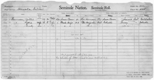 | Keywords: Enrollment for Seminole Census Card 405 - NARA - 267979.jpg Scope and content Name Choharjoche Type Parent Sex Male City of Residence e Name Cindy Harrison Type By Blood Age 1 Sex Female Degree Indian Blood 3/4 Roll Number 1350 City of Residence oh Name Lydia Harrison Type By Blood Age 18 Sex Female Degree Indian Blood Full Roll Number 1349 City of Residence oh Name Thomas Harrison Type Parent Sex Male City of Residence sb Name Willie Harrison Type By Blood Age 23 Sex Male Roll Number 1348 City of Residence sb Name Jennie Type Parent Sex Female City of Residence Caddo Name Susey Type Parent Sex Female City of Residence e General notes 267979 Local identifier 75-53A-SEMINOLE 405 Department of the Interior Office of Indian Affairs Office of the Commissioner to the Five Civilized Tribes 1893 - 1914 NARA's Southwest Region Fort Worth NRFA 1400 John Burgess Drive Fort Worth TX 76140 Record group Record Group 75 Records of the Bureau of Indian Affairs 1793 - 1999 Record group ARC 404 Enrollment Cards compiled 1898 - 1914 Series ARC 251747 File unit File unit ARC Variant control numbers NAIL Control Number NRFF-75-53A-27978<br /> NAIL Control Number NRFF-75-53A-35584<br /> NAIL Control Number NRFF-75-53A-35614<br /> NAIL Control Number NRFF-75-53A-35641<br /> NAIL Control Number NRFF-75-53A-35651<br /> NAIL Control Number NRFF-75-53A-37554<br /> NAIL Control Number NRFF-75-53A-48414<br /> NAIL Control Number NRFF-75-53A-SEMINOLE 405 Other versions <gallery> File Enrollment_for_Seminole_Census_Card_405_-_NARA_-_267979 tif tif File Enrollment_for_Seminole_Census_Card_405_-_NARA_-_267979 jpg jpg </gallery> NARA-cooperation PD-USGov Seminole census cards |