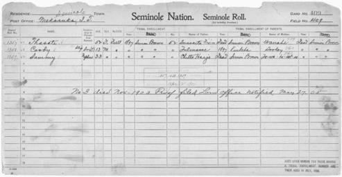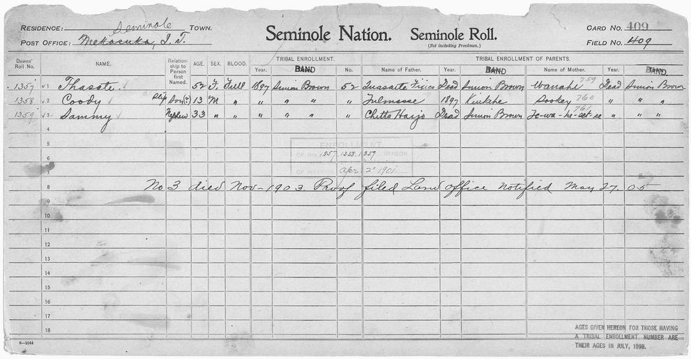 | Keywords: Enrollment for Seminole Census Card 409 - NARA - 267983.tif Scope and content Name Coody Type By Blood Age 13 Sex Male Degree Indian Blood Full Roll Number 1358 City of Residence sb Name Quasarte Fixico Type Parent Sex Male City of Residence sb Name Chitto Harjo Type Parent Sex Male City of Residence sb Name Sammy Type By Blood Age 33 Sex Male Degree Indian Blood Full Roll Number 1359 City of Residence sb Name Sookey Type Parent Sex Female City of Residence sb Name Tewahesetse Type Parent Sex Female City of Residence sb Name Thasate Type By Blood Age 52 Sex Female Degree Indian Blood Full Roll Number 1357 City of Residence sb Name Tulmasse Type Parent Sex Male City of Residence k Name Wanahe Type Parent Sex Female City of Residence sb General notes 267983 Local identifier 75-53A-SEMINOLE 409 Department of the Interior Office of Indian Affairs Office of the Commissioner to the Five Civilized Tribes 1893 - 1914 NARA's Southwest Region Fort Worth NRFA 1400 John Burgess Drive Fort Worth TX 76140 Record group Record Group 75 Records of the Bureau of Indian Affairs 1793 - 1999 Record group ARC 404 Enrollment Cards compiled 1898 - 1914 Series ARC 251747 File unit File unit ARC Variant control numbers NAIL Control Number NRFF-75-53A-28734<br /> NAIL Control Number NRFF-75-53A-32058<br /> NAIL Control Number NRFF-75-53A-34192<br /> NAIL Control Number NRFF-75-53A-45660<br /> NAIL Control Number NRFF-75-53A-47640<br /> NAIL Control Number NRFF-75-53A-48907<br /> NAIL Control Number NRFF-75-53A-48936<br /> NAIL Control Number NRFF-75-53A-50122<br /> NAIL Control Number NRFF-75-53A-50583<br /> NAIL Control Number NRFF-75-53A-SEMINOLE 409 yes Other versions <gallery> File Enrollment_for_Seminole_Census_Card_409_-_NARA_-_267983 tif tif File Enrollment_for_Seminole_Census_Card_409_-_NARA_-_267983 jpg jpg </gallery> NARA-cooperation PD-USGov Seminole census cards NARA TIF images with categorized JPGs |